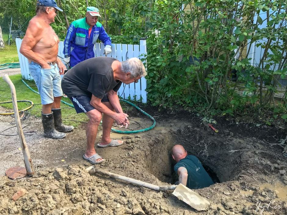 Heinäkuun lopulla joutuivat kaivinkone ja ahkerat miehet vielä hommiin. Taas putkirikko!