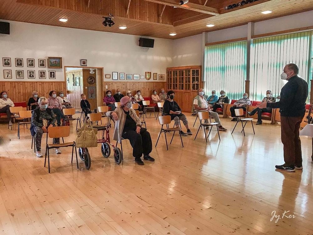 Perinteinen lauluilta toteutettiin nyt Koronarajoitusten vuoksi Kartanon terassilla 15.8. Sadettakin piti pidätellä. Pousin Pirkko ammattitaitoisesti veti tilaisuuden.