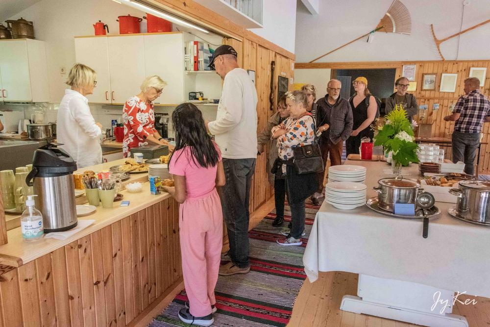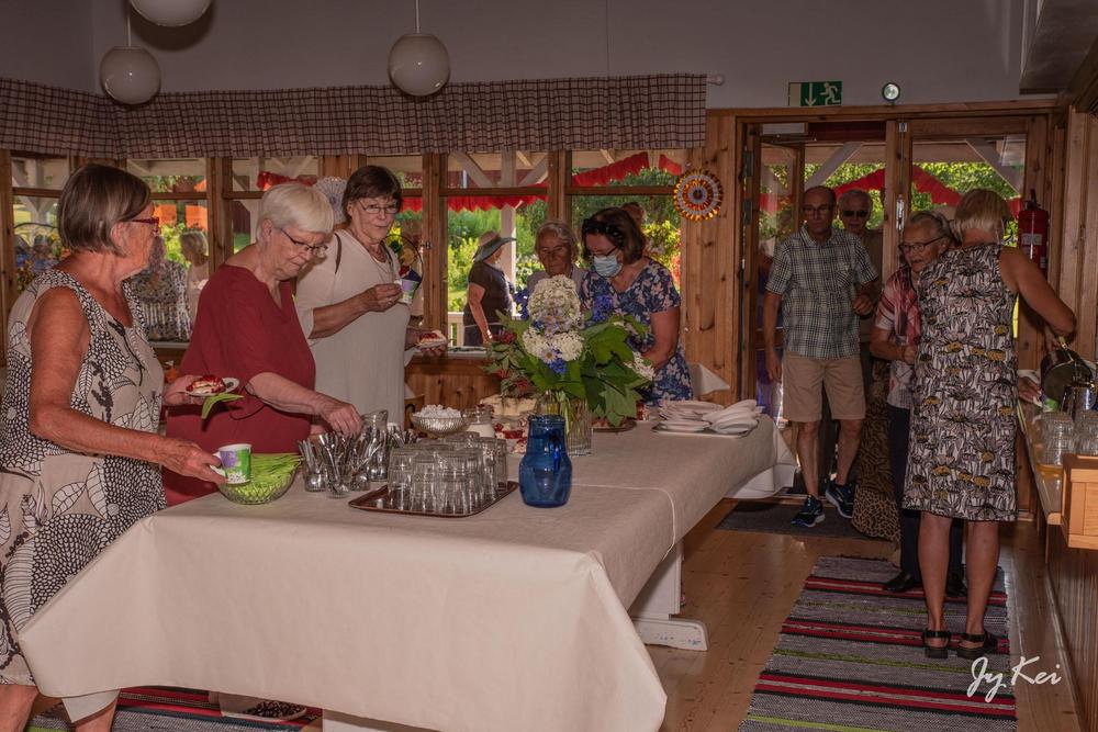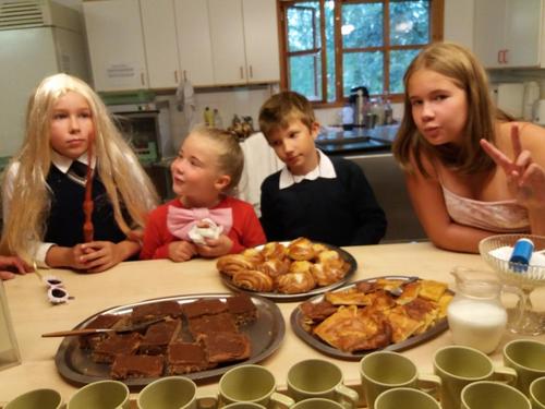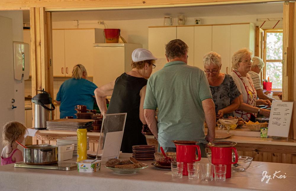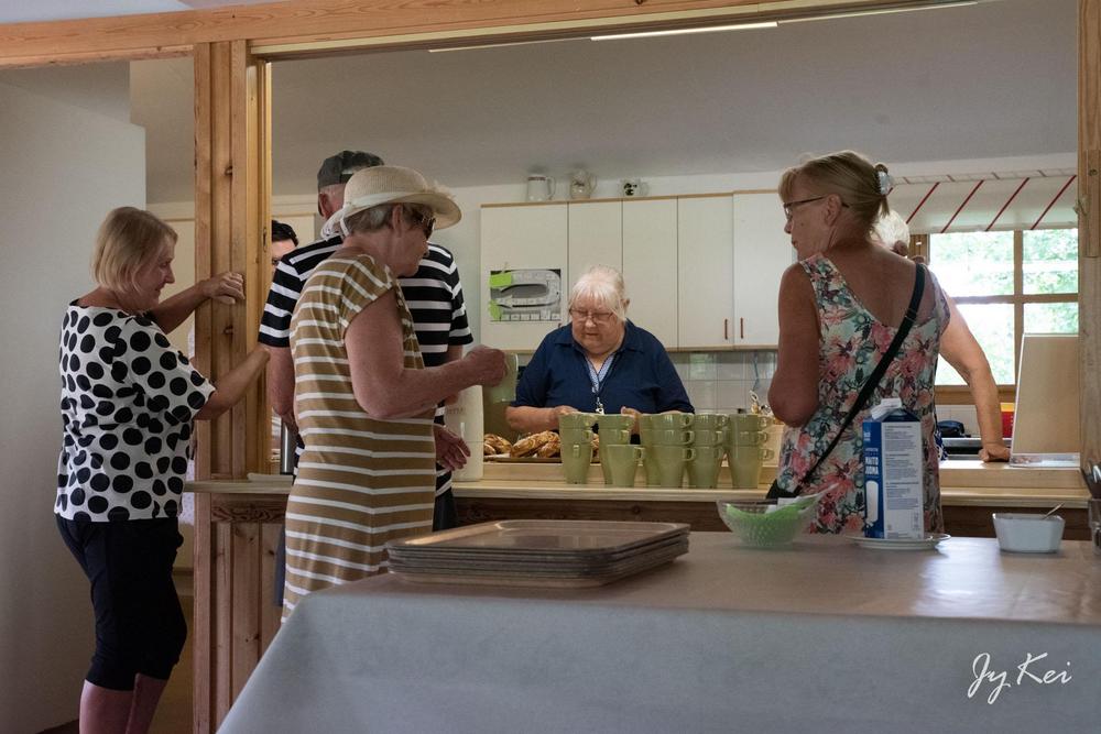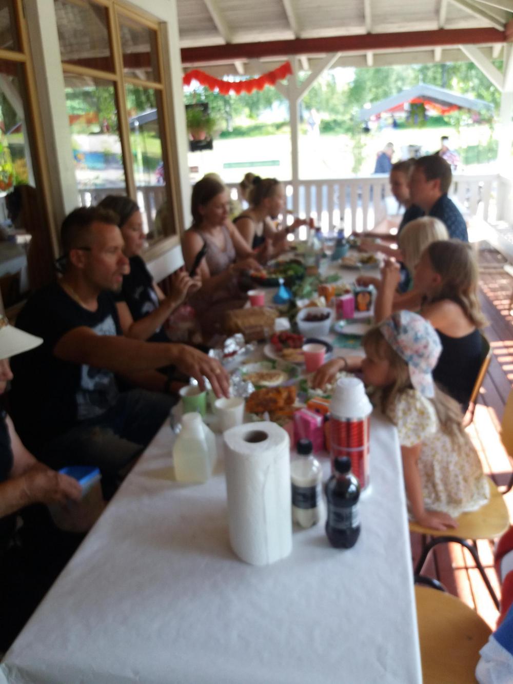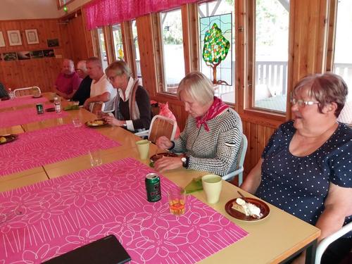Piknikin jälkeen kutsuttiin koko porukka juhlakahveille. Tarjolla oli erinomaista mansikkakakkua.
