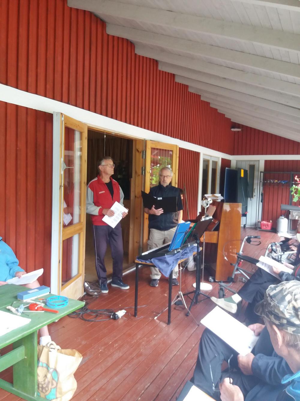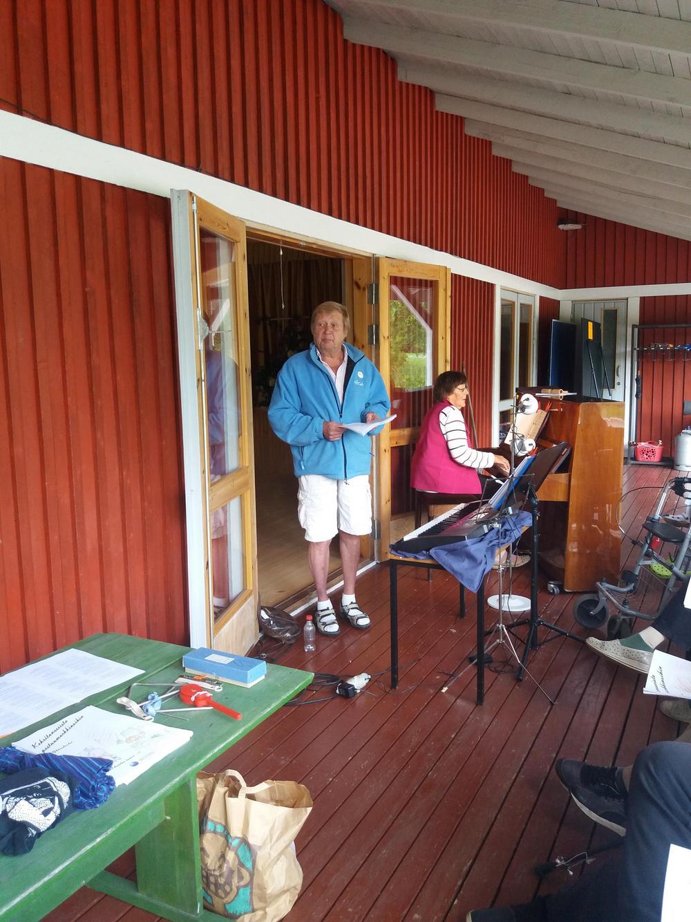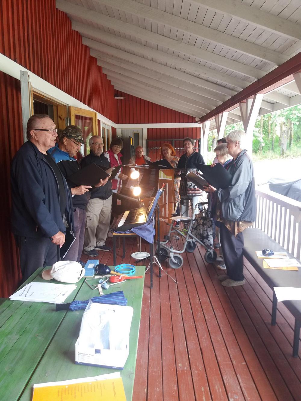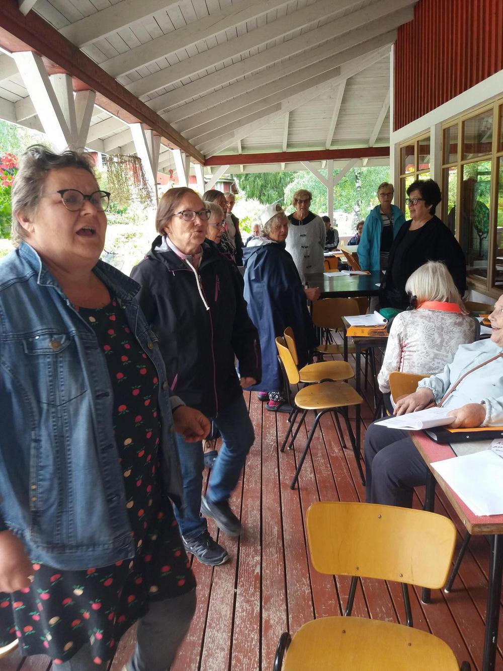 Perinteinen lauluilta toteutettiin nyt Koronarajoitusten vuoksi Kartanon terassilla 15.8. Sadettakin piti pidätellä. Pousin Pirkko ammattitaitoisesti veti tilaisuuden.