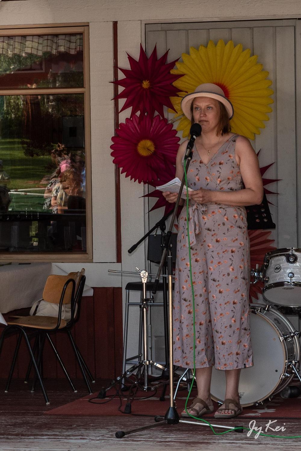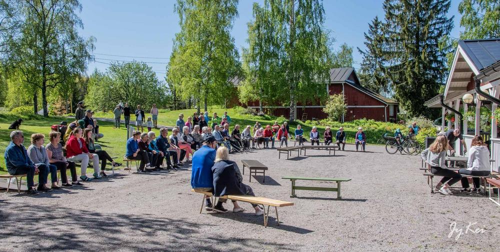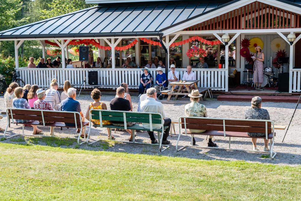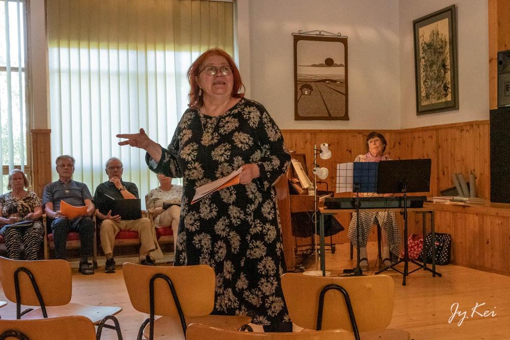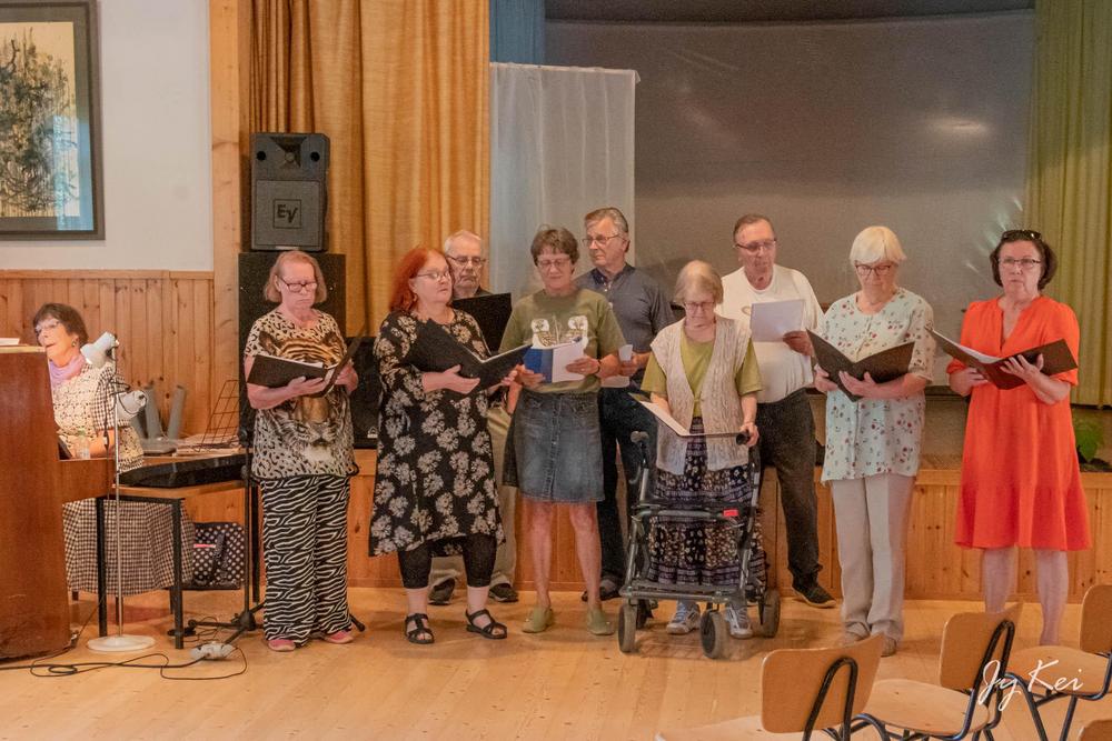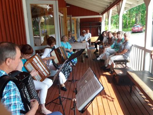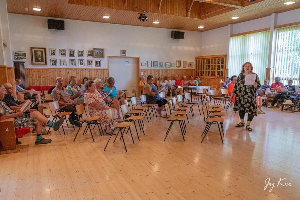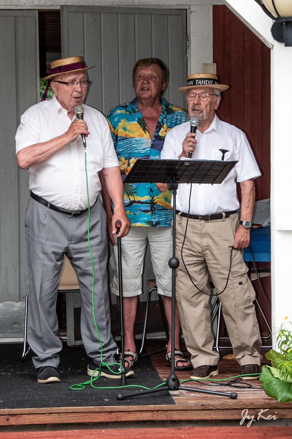 Perinteinen lauluilta toteutettiin nyt Koronarajoitusten vuoksi Kartanon terassilla 15.8. Sadettakin piti pidätellä. Pousin Pirkko ammattitaitoisesti veti tilaisuuden.