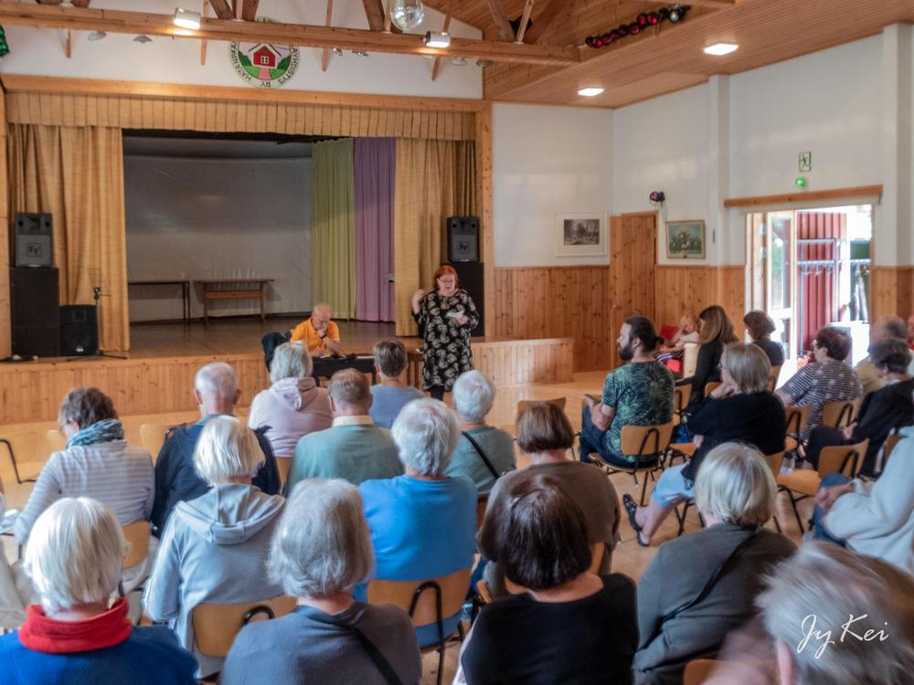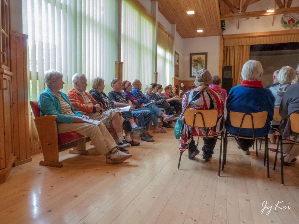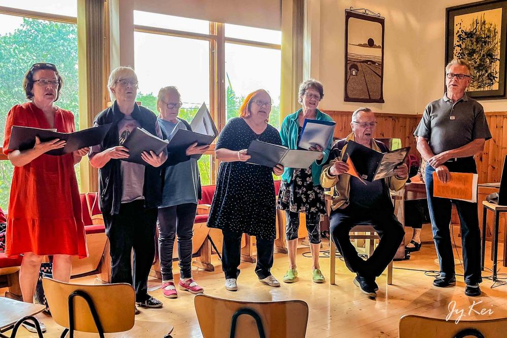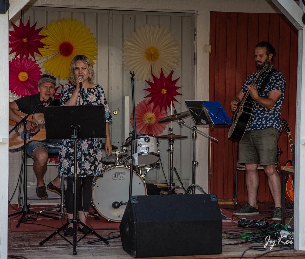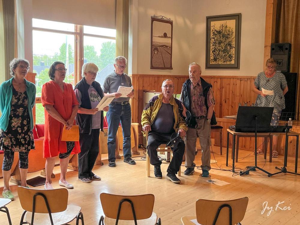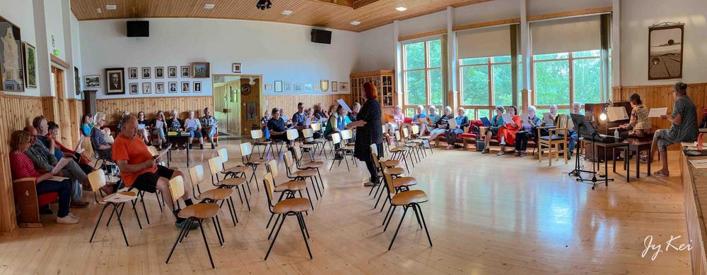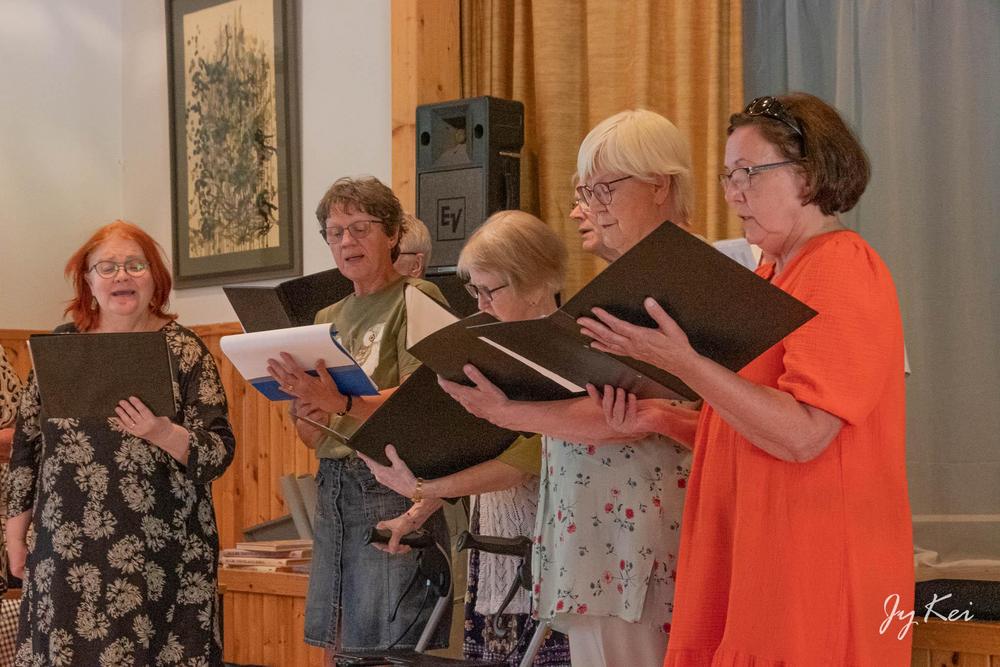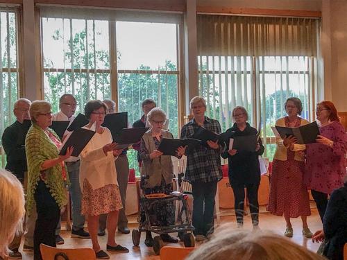 Perinteinen lauluilta toteutettiin nyt Koronarajoitusten vuoksi Kartanon terassilla 15.8. Sadettakin piti pidätellä. Pousin Pirkko ammattitaitoisesti veti tilaisuuden.