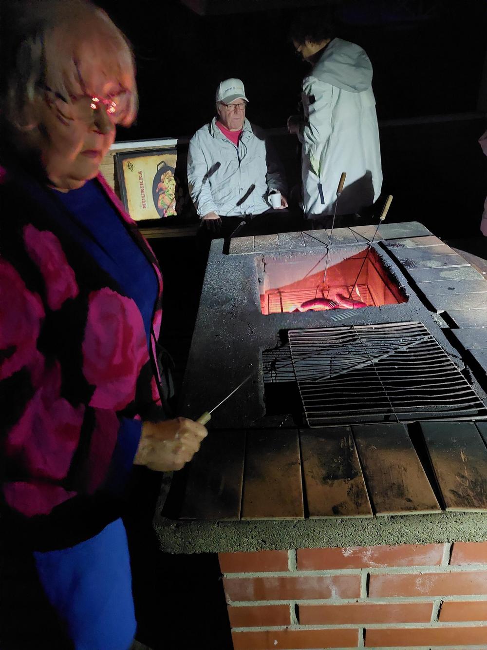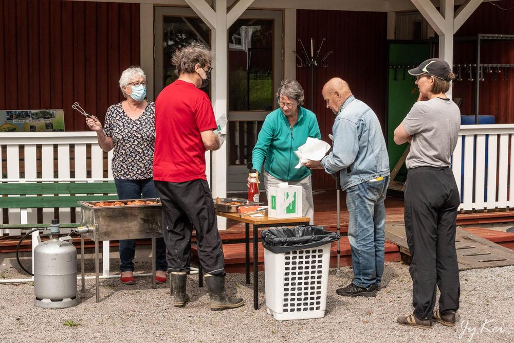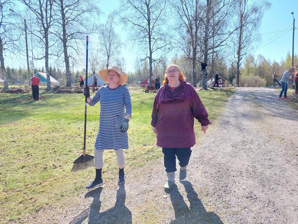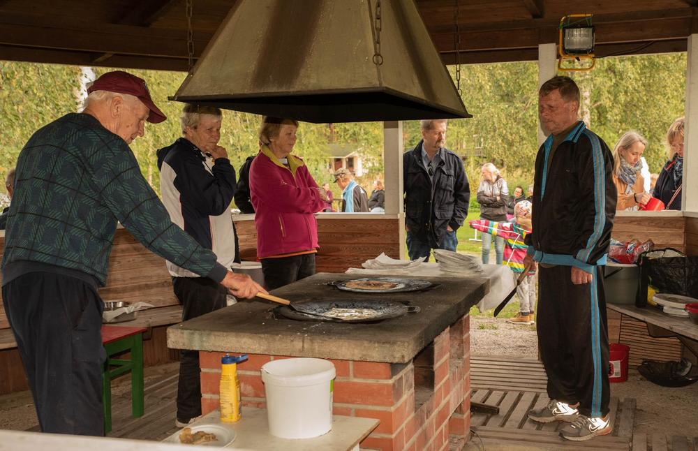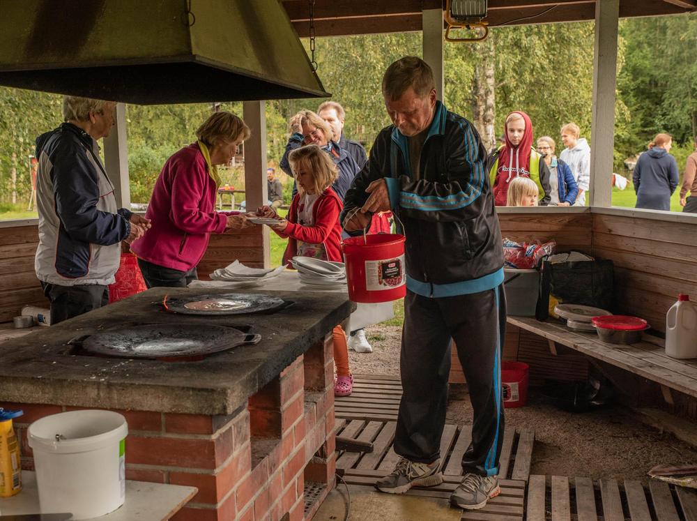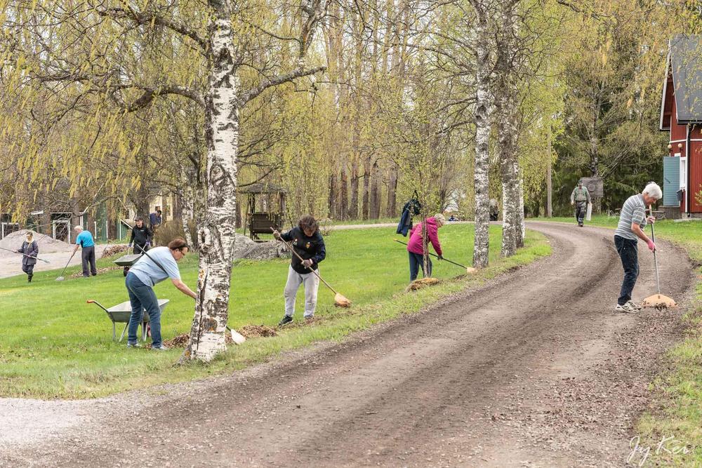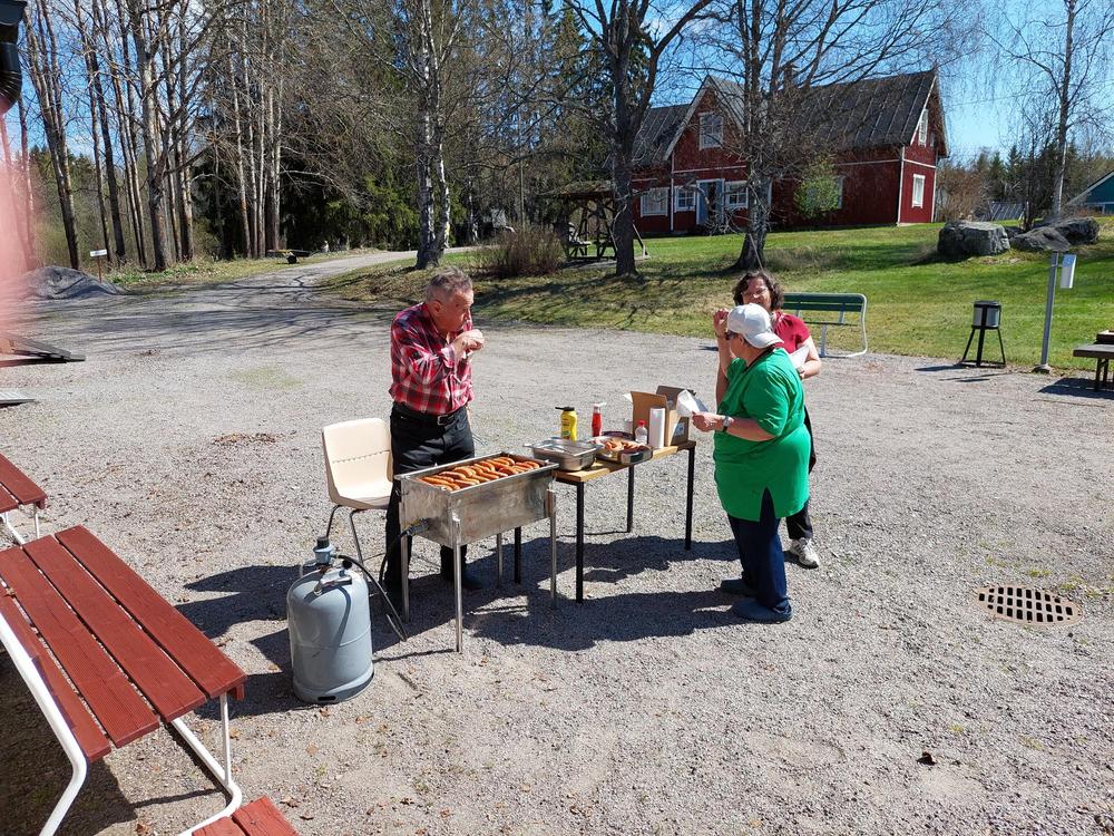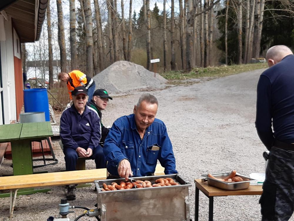 Kevään haravointitalkoisiin otti osaa noin 60 mökkiläistä. Työn jälkeen maittoivat Palttalan Pekan grillaamat makkarat.
