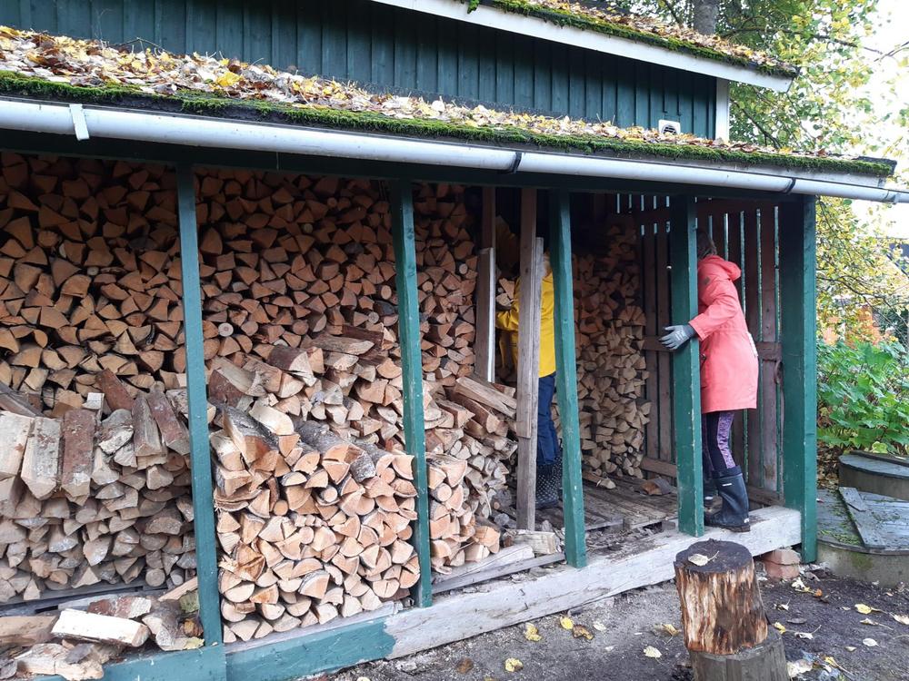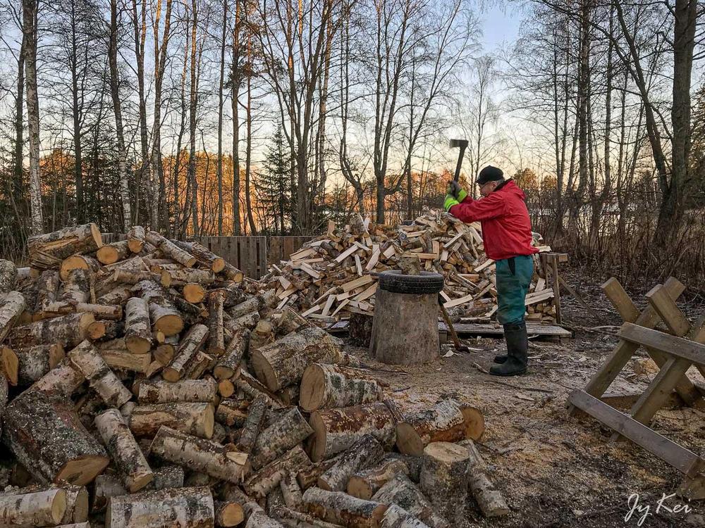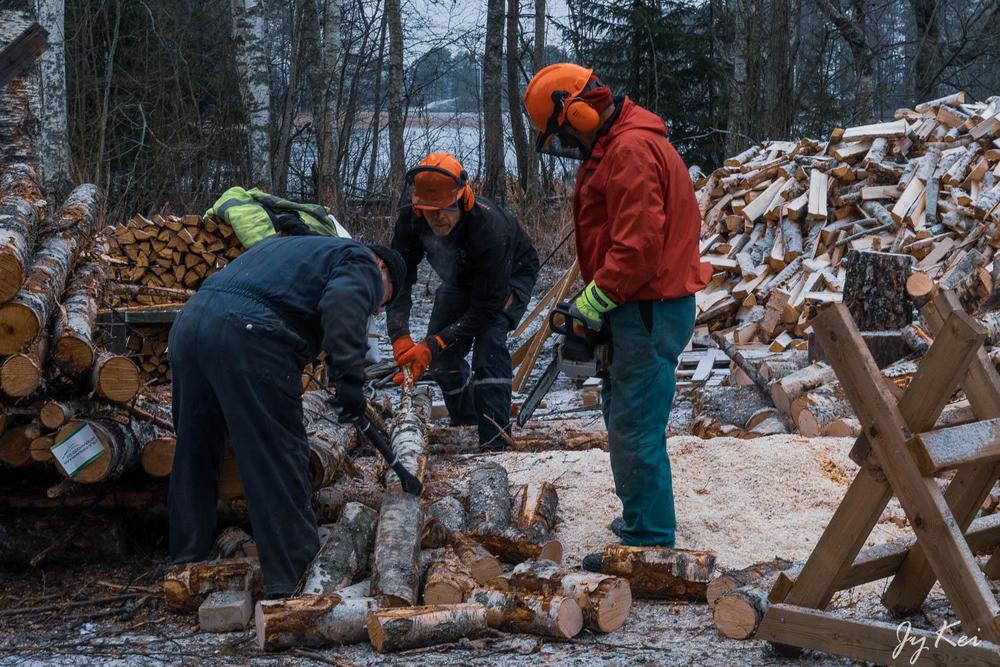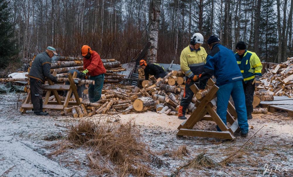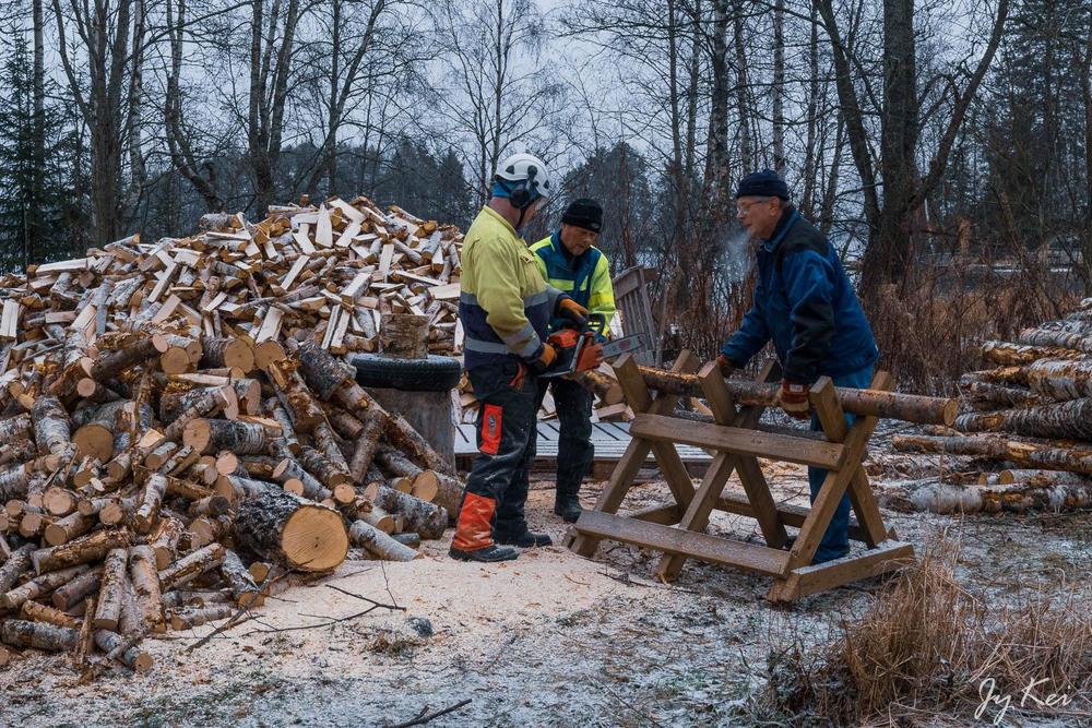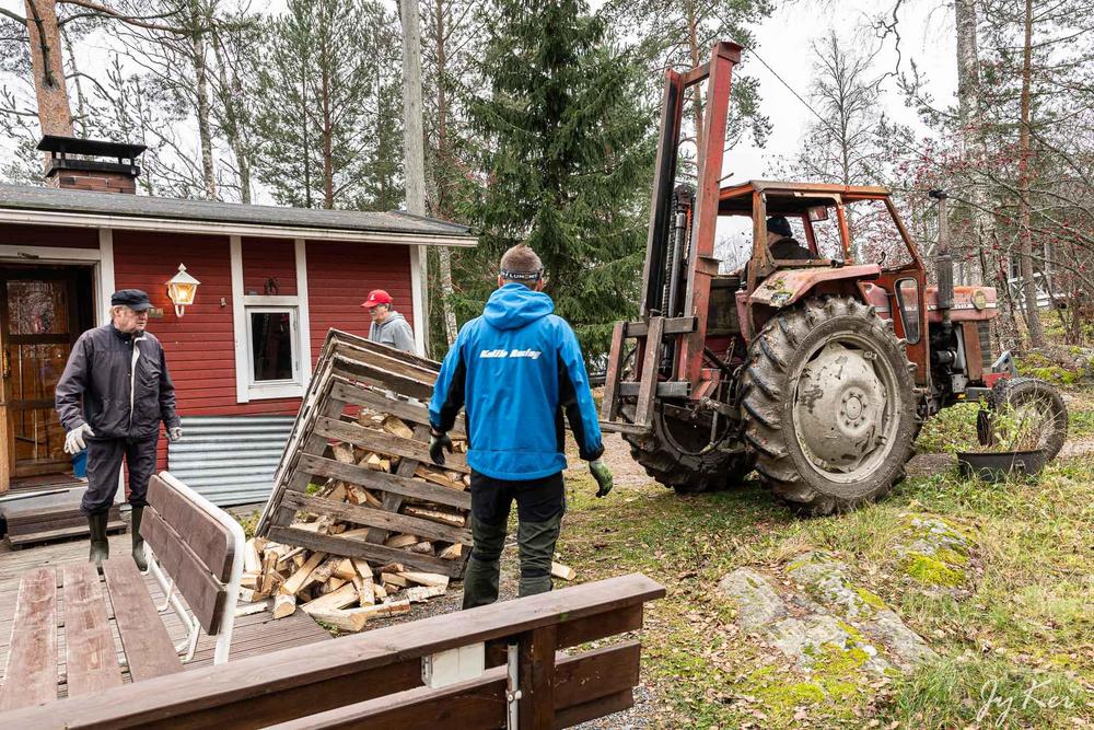 Talvisaunakausi alkamassa. Pikkusaunan piippu nuohottiin, kiukaan kivet vaihdettiin. Luhtaalta tilatut puut siirrettiin pukuhuoneeseen. Takkahuoneen sähkökulutus merkattiin. Mukana Isäntä Antti, Sepän Antti ja Jokisen Ahti