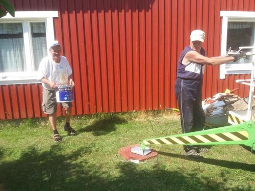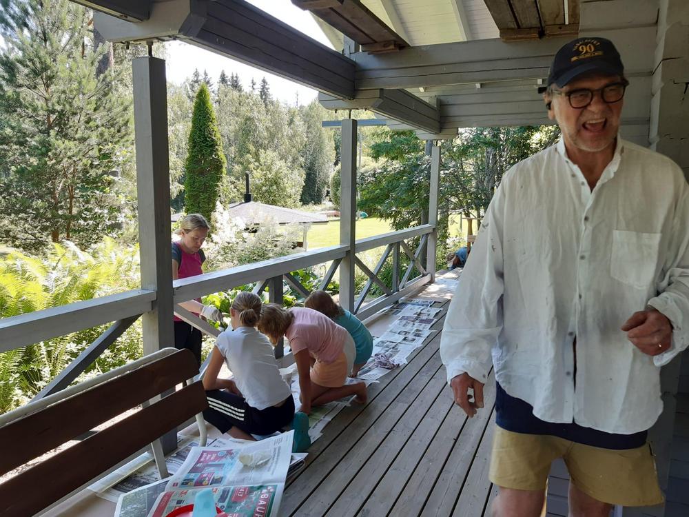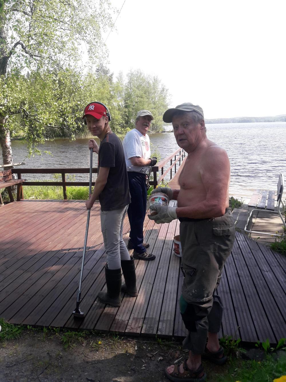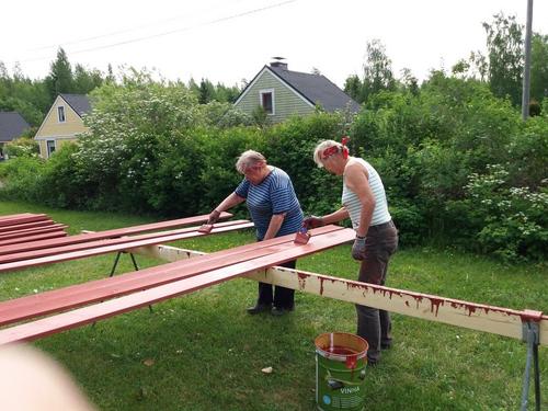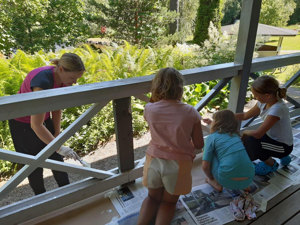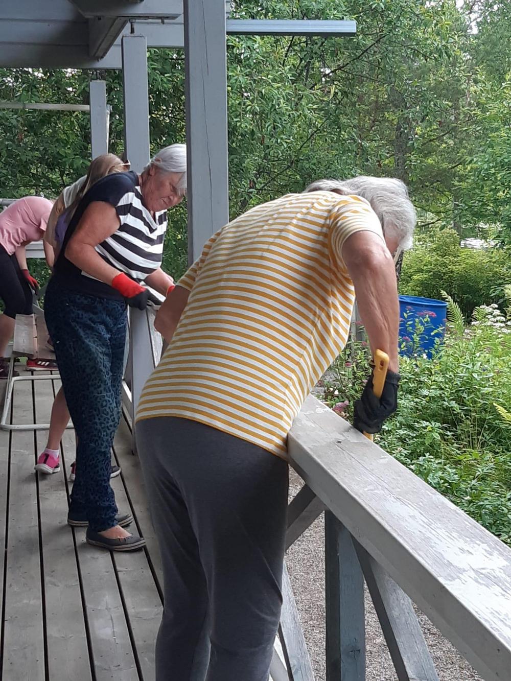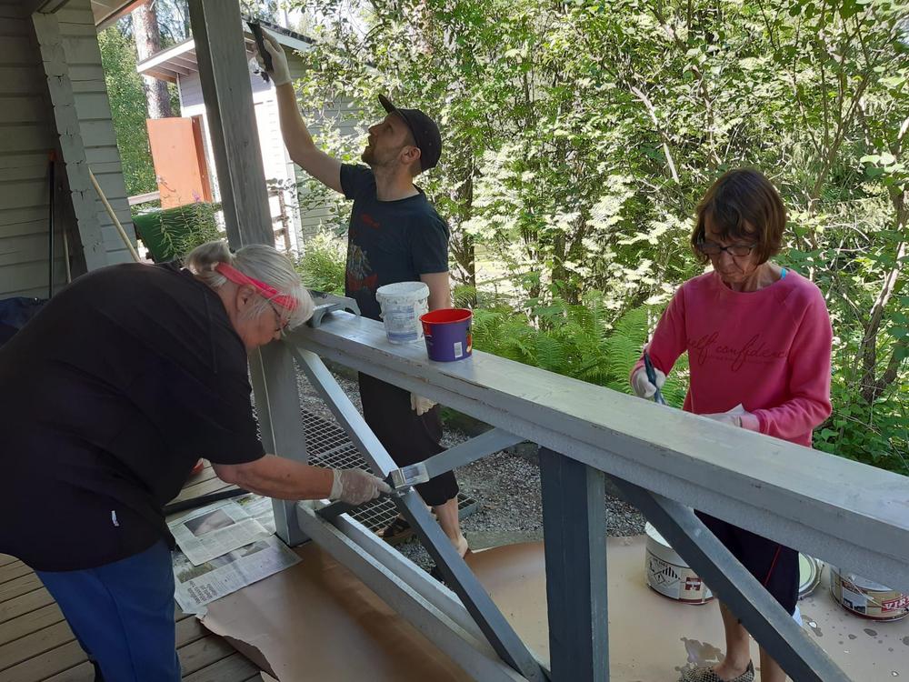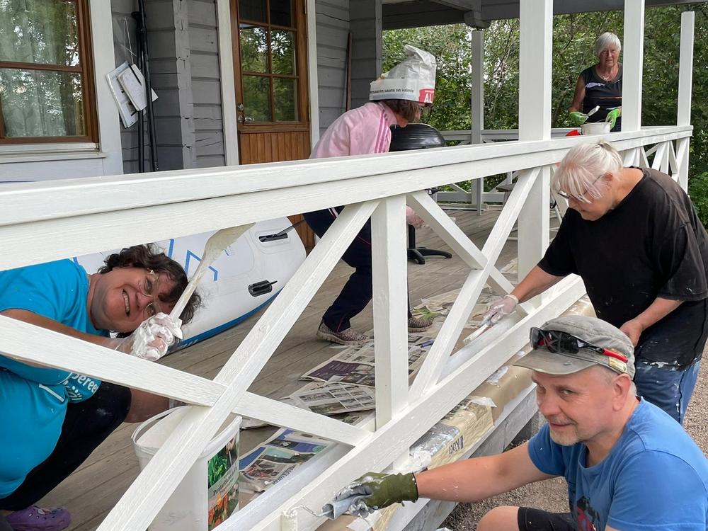 Maanantai-iltaisin tehdään yhteisötalkoita. Tässä vuorossa rantasaunan kaiteiden kunnostus. Ensin vanha maali pois, sitten uusi tilalle.Innokkaita talkoolaisia riitti. Nuorta ja vähän vanhempaa.