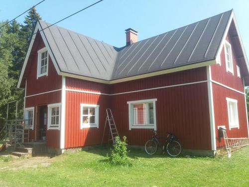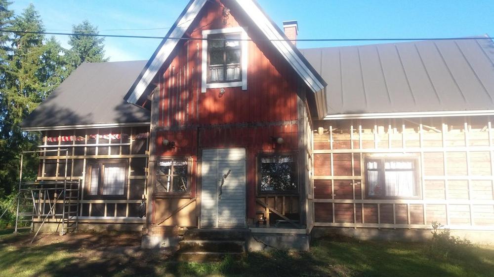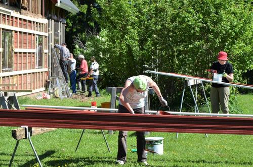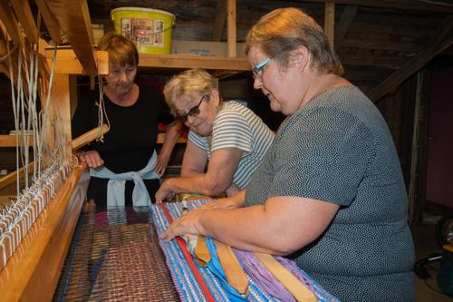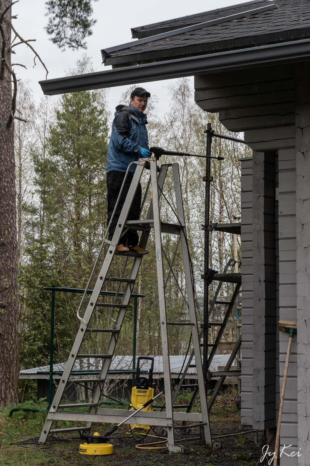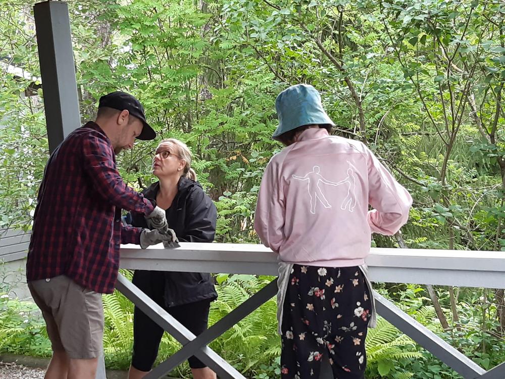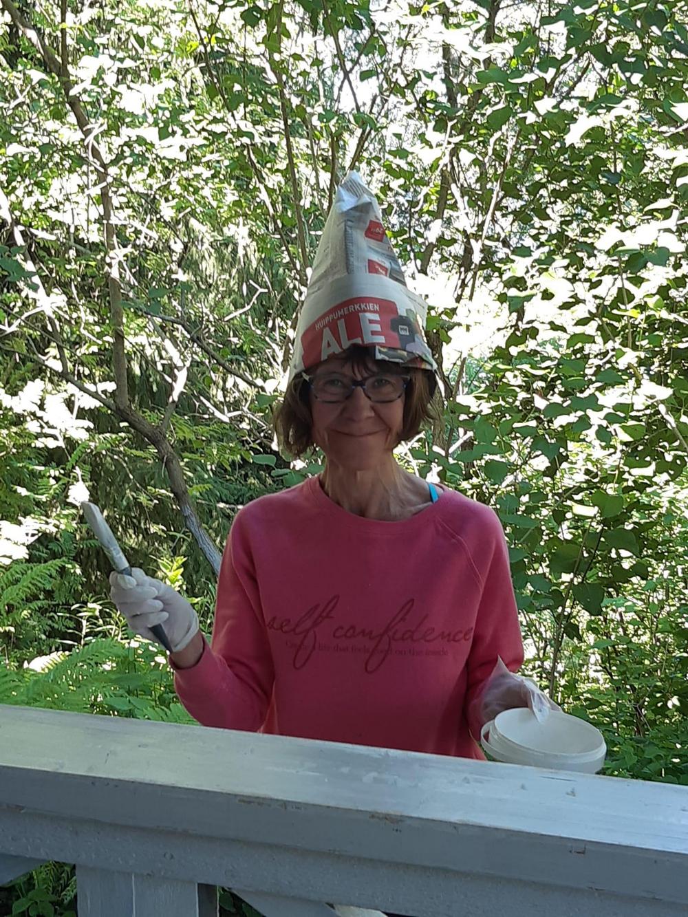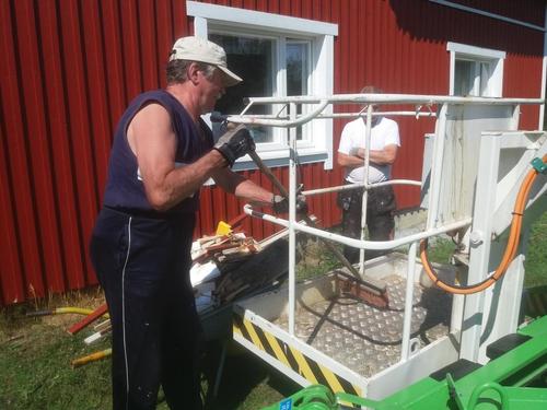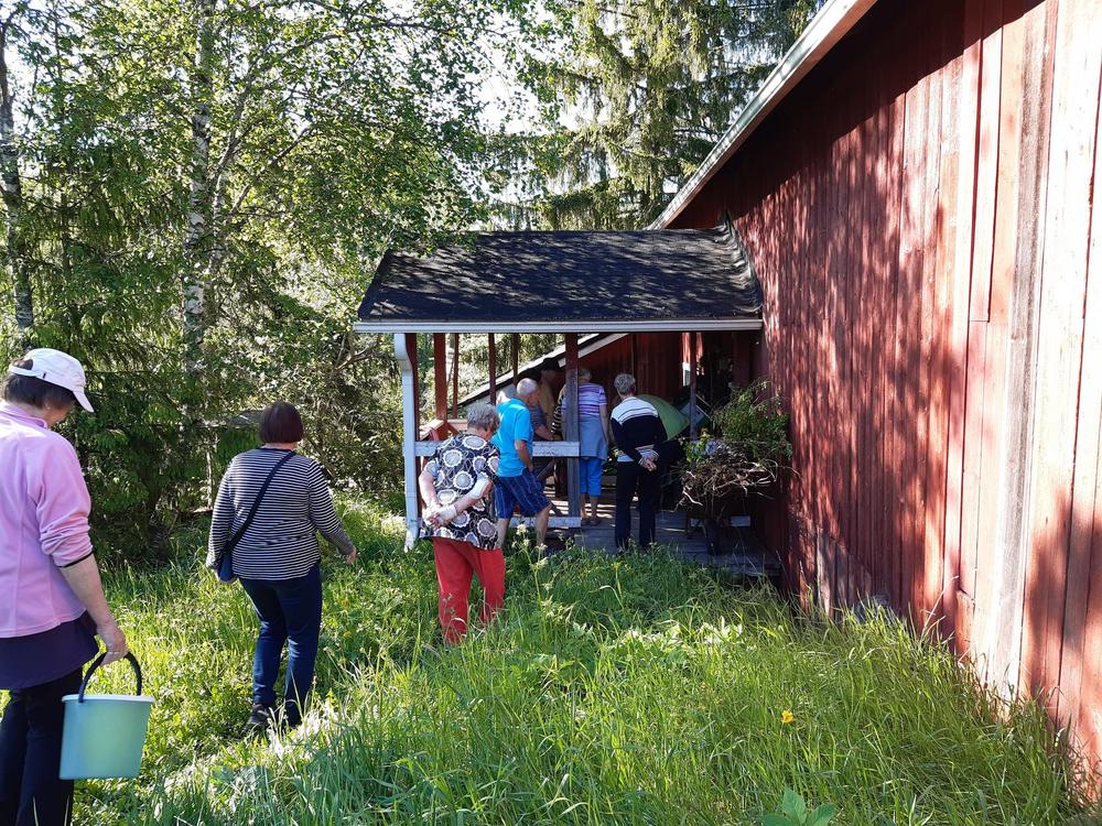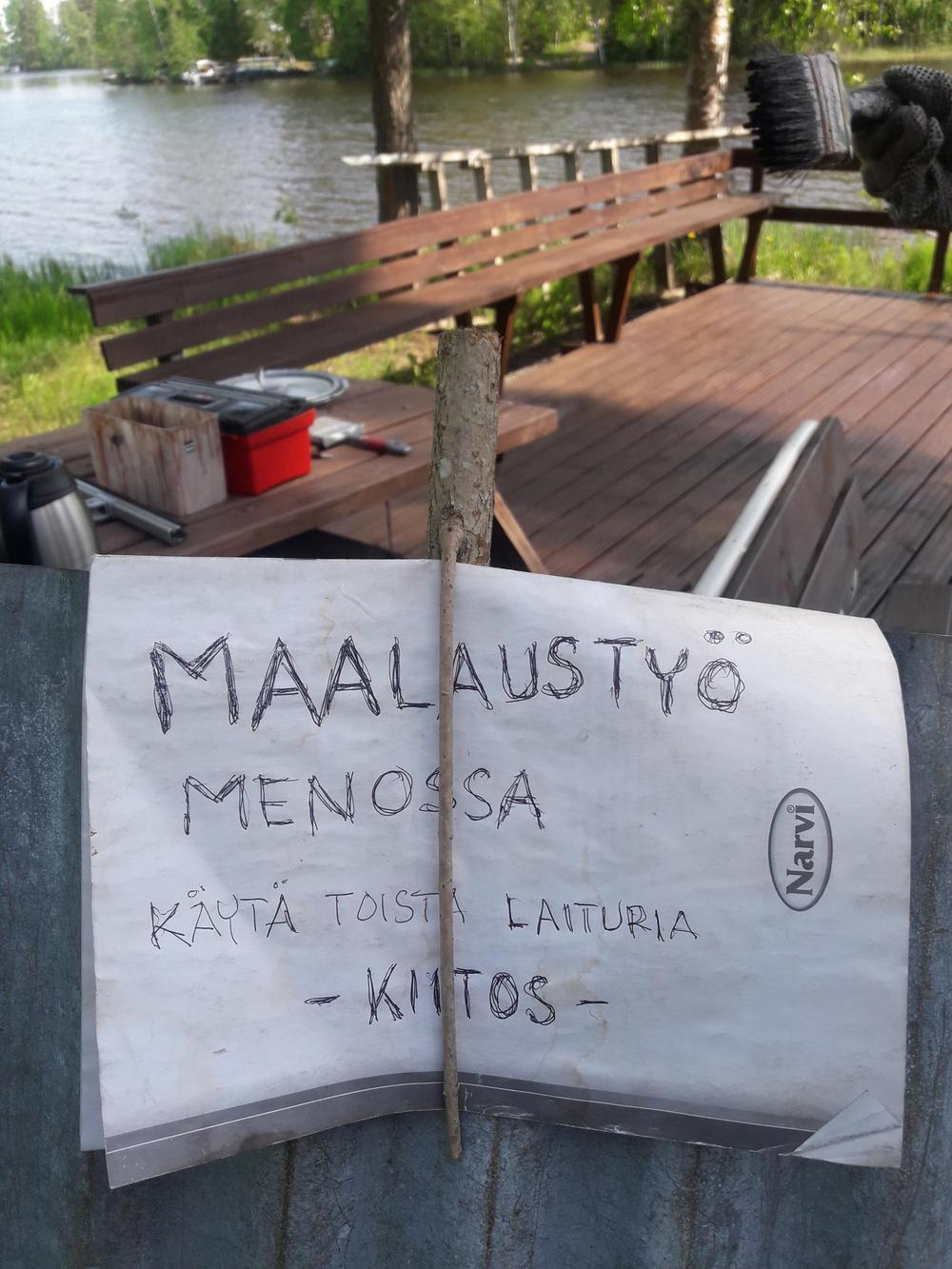 Maanantai-iltaisin tehdään yhteisötalkoita. Tässä vuorossa rantasaunan kaiteiden kunnostus. Ensin vanha maali pois, sitten uusi tilalle.Innokkaita talkoolaisia riitti. Nuorta ja vähän vanhempaa.