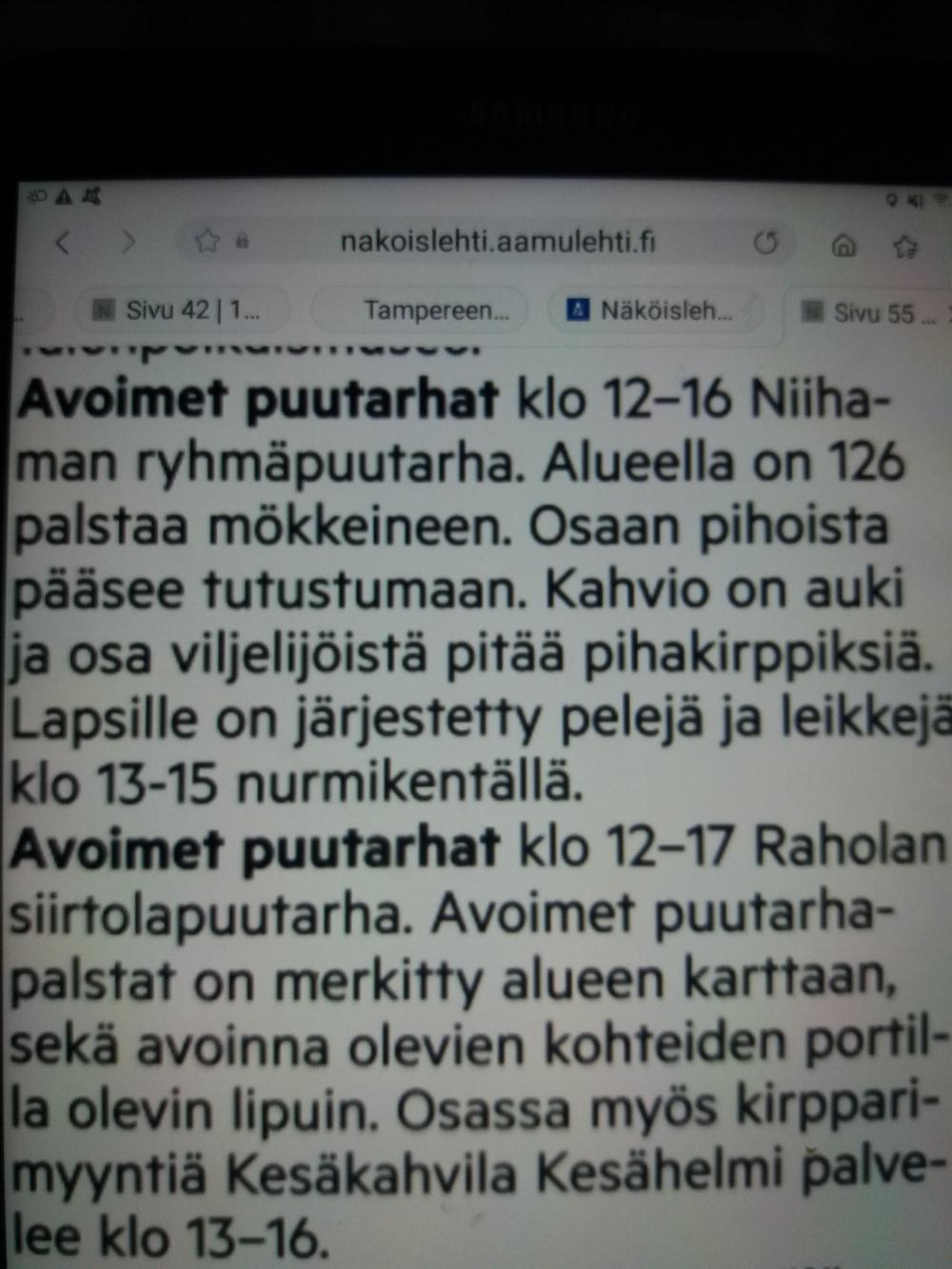 Tänä kesänä Avomet puutarhat tapahtumaa vietettiin 9.7. Niihamaankin löysi satoja tutustujia, vieraita ja tuttuja.Pysäköinnin opastajat eivät ehtineet kahvioon syömään Marjan keittämää herkullista hernesoppaa, piti syödä työn ohessa. Soppa maittoi vieraillekin, kahviossa oli ajoittain tosi ruuhkaista. Pienoisnäytelmää Kylien kaiut tuli Kartanon salin täydeltä katsojia seuraamaan. Tässä on kuvia vieraista, kirppiksistä, pihoista. Hieno päivä taas.