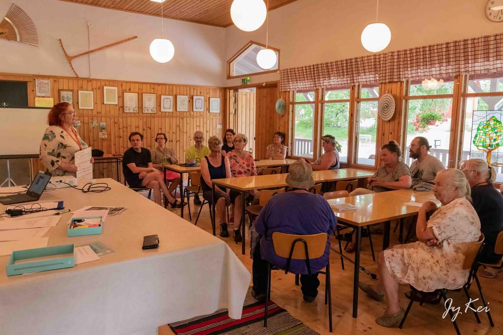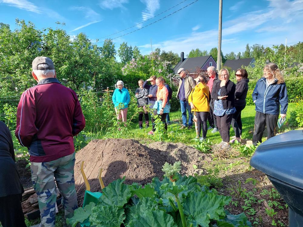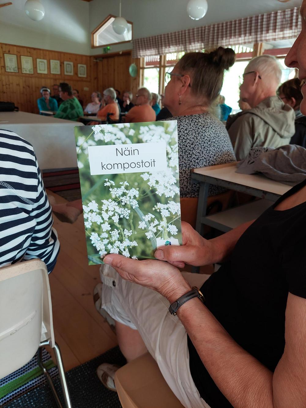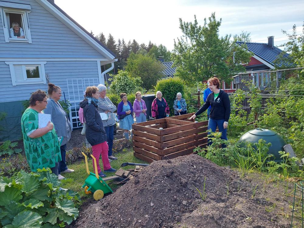 Ympäristöteema jatkui kompostoinnin opastuksella. Pirkanmaan Marttojen edustaja esitti asian luennolla Kartanon kahviossa, joka täyttyikin kuulijoista. Sen jälkeen siirryimme mökin 34 pihalle tutustumaan juuri rakennettuun kompostiin havainnollisesti. Tärkeää tietoa, kiitos!!