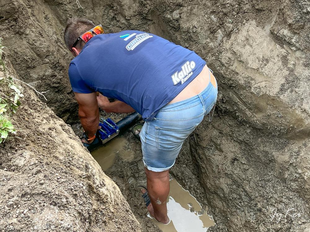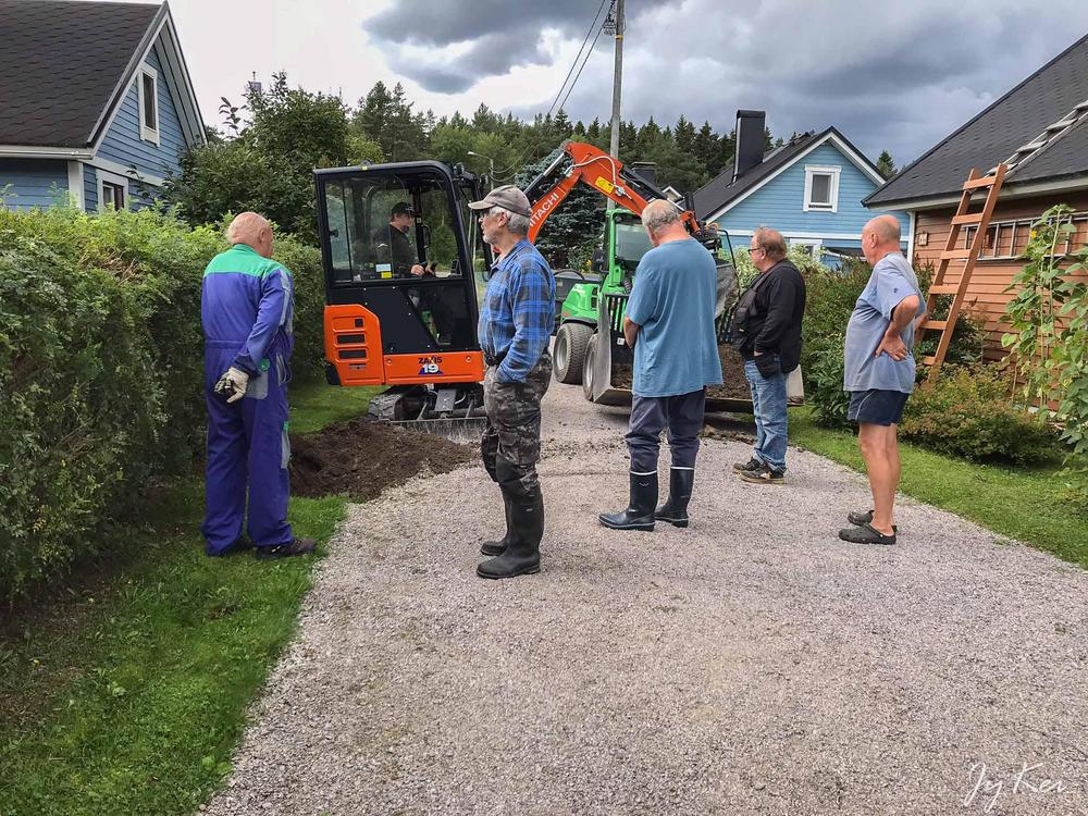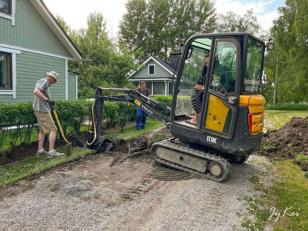 Heinäkuun lopulla joutuivat kaivinkone ja ahkerat miehet vielä hommiin. Taas putkirikko!