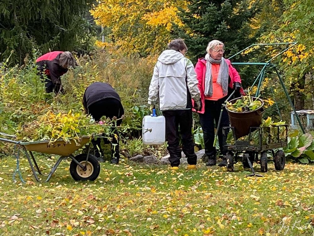 Yhdistyksen syystalkoot järjestettiin syyskuun viimeisenä lauantaina. Viitisenkymmentä ahkeraa siivosi pihaa, laittoi muutenkin paikkoja talvikuntoon. Sää suosi, tunnelma oli tosi mukava. Talkoitten päätteeksi soitettiin Kartanon vellikelloa ja kutsuttiin väki talkootarjoomisille. Makkara ja kahvi tykötarpeineen maittoivat.